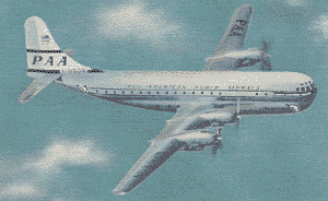 One of Pan American's huge new Double Decked "Strato" Clippers...the fastest, most luxurious air lines in the world.